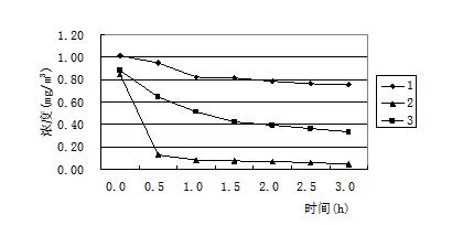 圖2 比較(圖2)中的三條凈化效率曲線可以看出,在相同的測(cè)試條件下,使用相同的技術(shù),但是凈化效率卻有很大差異,2號(hào)產(chǎn)品能使甲醛濃度迅速下降,1h內(nèi)即達(dá)到0.1mg/m3以下,可是1號(hào)產(chǎn)品在開啟3h后,甲醛濃度依舊在0.7mg/m3以上。許多研究表明,光催化可以在常溫常壓下即可將空氣中的有害氣體分解成無毒物質(zhì)[7],而且沒有二次污染,是一種有效的去除各種室內(nèi)污染物的先進(jìn)技術(shù),但在我們測(cè)試的同時(shí)檢測(cè)環(huán)境艙內(nèi)的臭氧濃度,發(fā)現(xiàn)臭氧濃度在光催化技術(shù)的凈化器凈化過程中均有不同程度的升高。這說明在考慮選擇光催化凈化產(chǎn)品的同時(shí),不應(yīng)該忽視其副產(chǎn)物臭氧的存在。另外光催化產(chǎn)品還存在催化劑失活的現(xiàn)象。催化失活是指催化劑表面被反應(yīng)產(chǎn)物或顆粒物覆蓋,失去催化效果,必須及時(shí)更換核心部件。因此如何選擇副產(chǎn)物的生成量較小,并且壽命較長(zhǎng)的催化產(chǎn)品是催化劑類凈化器選型的關(guān)鍵。同一臺(tái)凈化機(jī)改進(jìn)前后凈化效率的比較 由于同種技術(shù)的凈化效果會(huì)因?yàn)樵O(shè)計(jì)工藝或者制造技術(shù)的不同形成較大差異,所以很多凈化器廠家也在不停的改進(jìn)生產(chǎn),希望可以得到效果好、副產(chǎn)物少、壽命長(zhǎng)的產(chǎn)品。圖3中表示的是一家使用復(fù)合式技術(shù)廠家生產(chǎn)的凈化產(chǎn)品,主要采用的技術(shù)有過濾、吸附、高壓靜電和負(fù)離子,(圖1、2、3)中曲線分別是同一臺(tái)凈化器未經(jīng)過改進(jìn)和兩次改進(jìn)后得到的凈化效率曲線,三次試驗(yàn)時(shí)凈化器內(nèi)部結(jié)構(gòu)基本相同,只是在關(guān)鍵技術(shù)處做出調(diào)整,測(cè)試時(shí)得出的凈化效率有明顯差異。從圖中可以清晰的看出,三條凈化效率曲線明顯由低到高,說明關(guān)鍵技術(shù)的調(diào)試對(duì)凈化器的凈化效率有顯著影響。